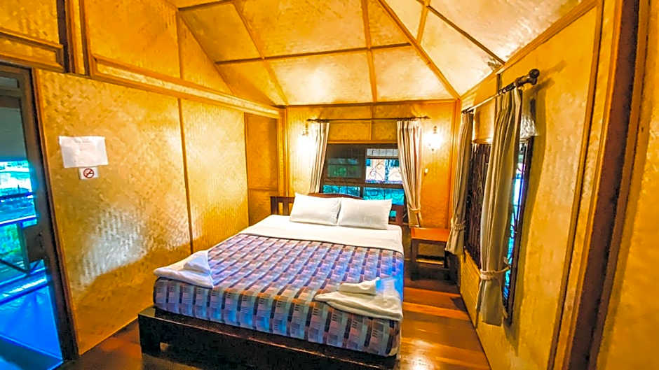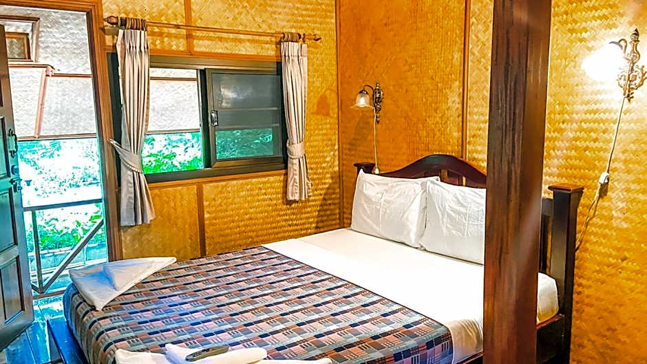 This detached wooden bungalow features a patio with seating area.